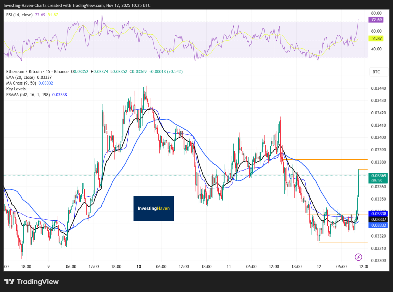- The ETH/BTC ratio sits around 0.0333, showing BTC still holds a slight performance edge.