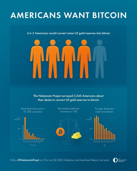 A survey by The Nakamoto Project reveals a significant shift in American sentiment towards digital assets, with 80% of the respondents favoring conversion of a portion of the US gold reserves into Bitcoin.