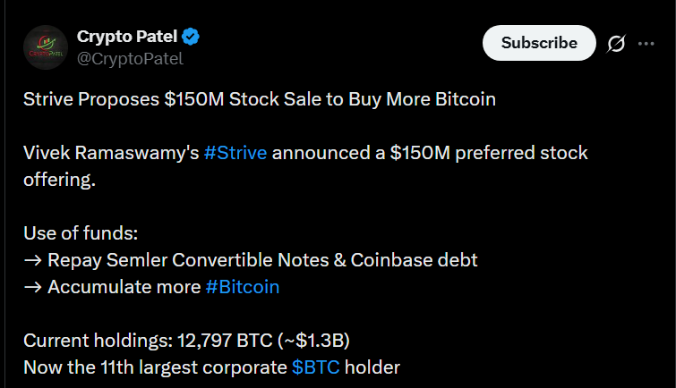 Strive announced a $150M preferred securities offering in late January 2026, with plans to buy Bitcoin and reduce outstanding debt.