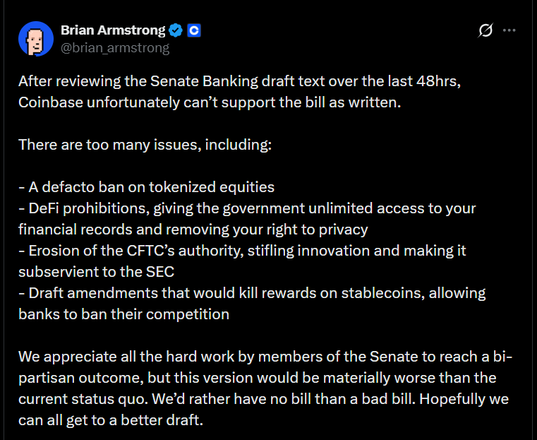 On Jan 15, Coinbase CEO Brian Armstrong said the exchange “cannot support” the Senate’s latest crypto bill in its current form, forcing the Senate Banking Committee to postpone its planned markup hours later.