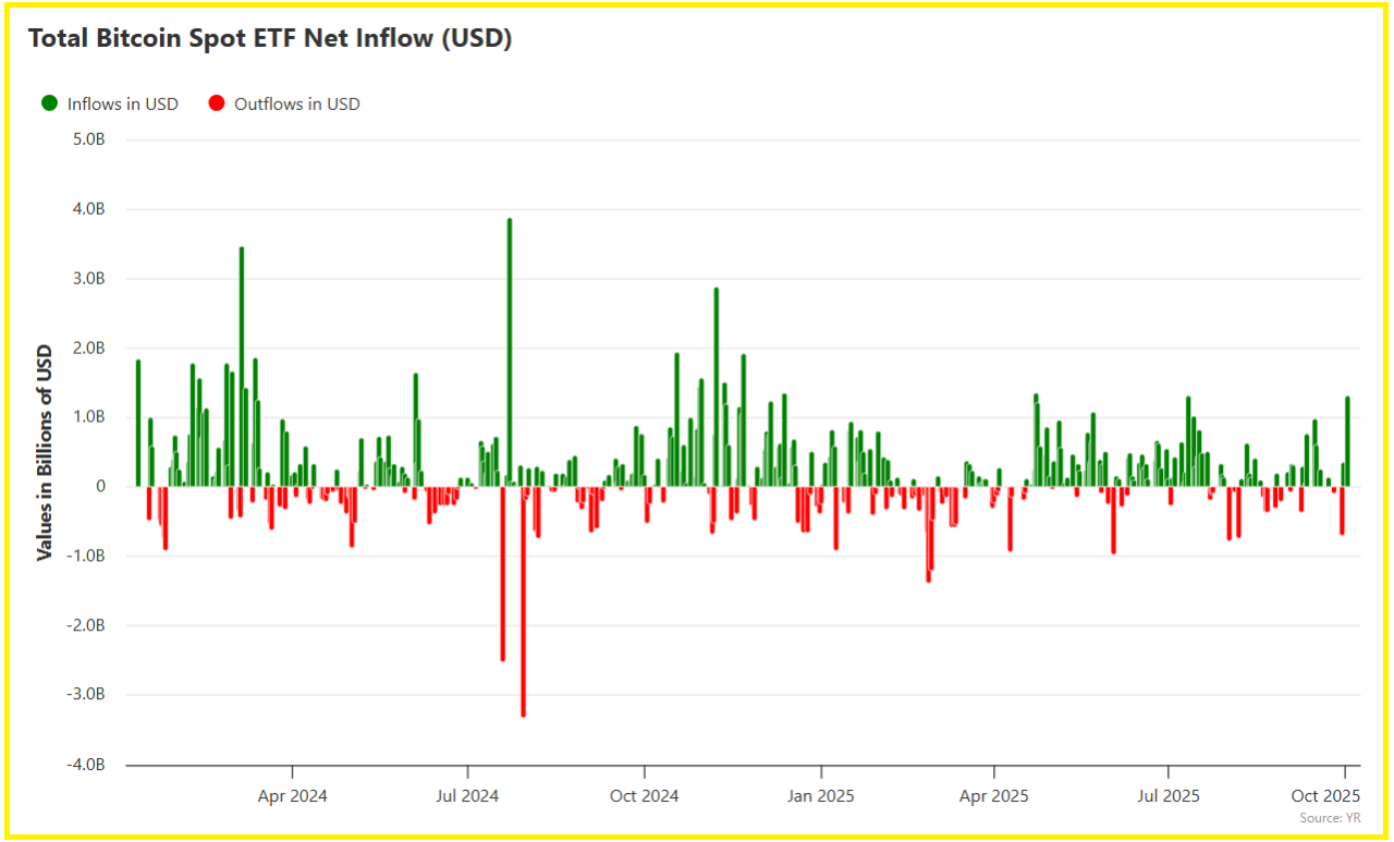 Bitcoin ETFs absorbed roughly $3.2–3.3B in net inflows last week, marking one of their largest weekly totals. This surge reduced available supply and helped price climb above key resistance levels.