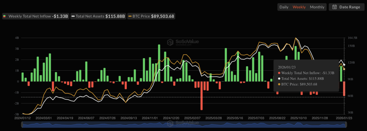 The $1.33B withdrawn last week signals reduced institutional demand at current prices.