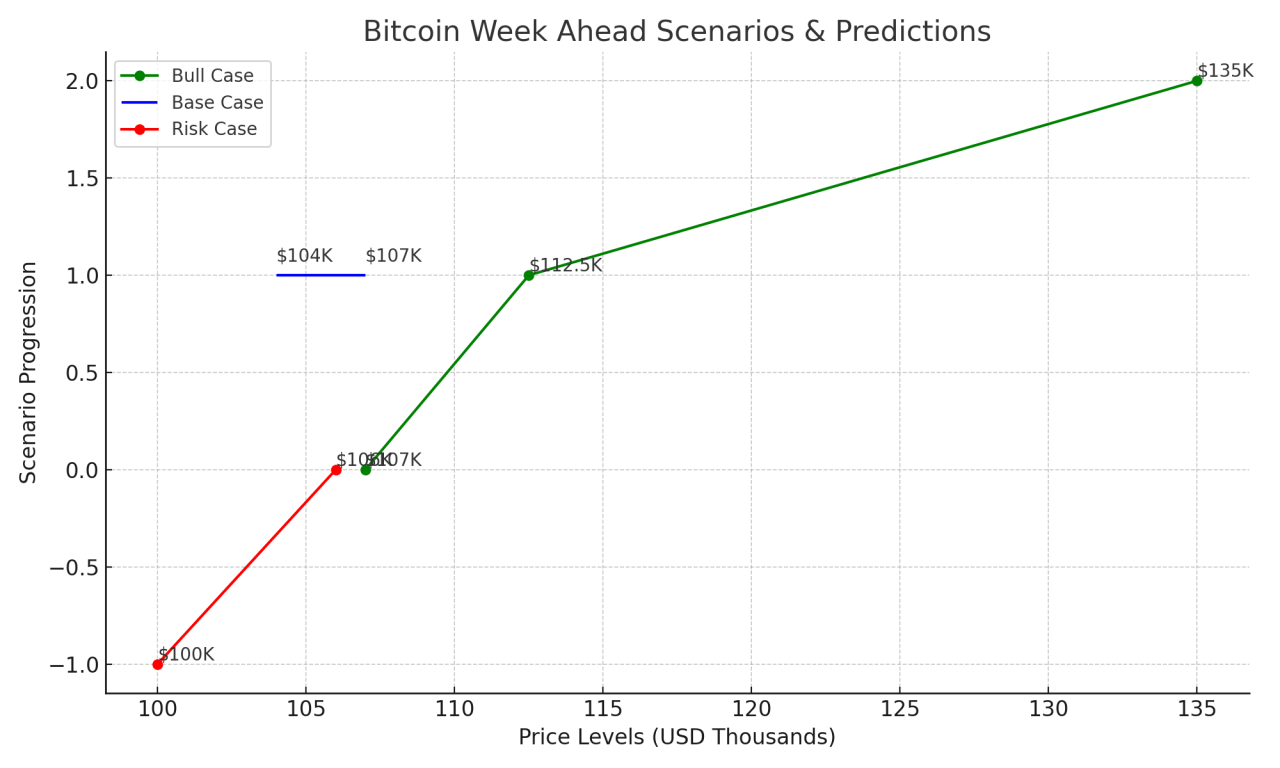 - Base case: Sideways action in the $104K–$107K range continues as the market digests flows and macro data.