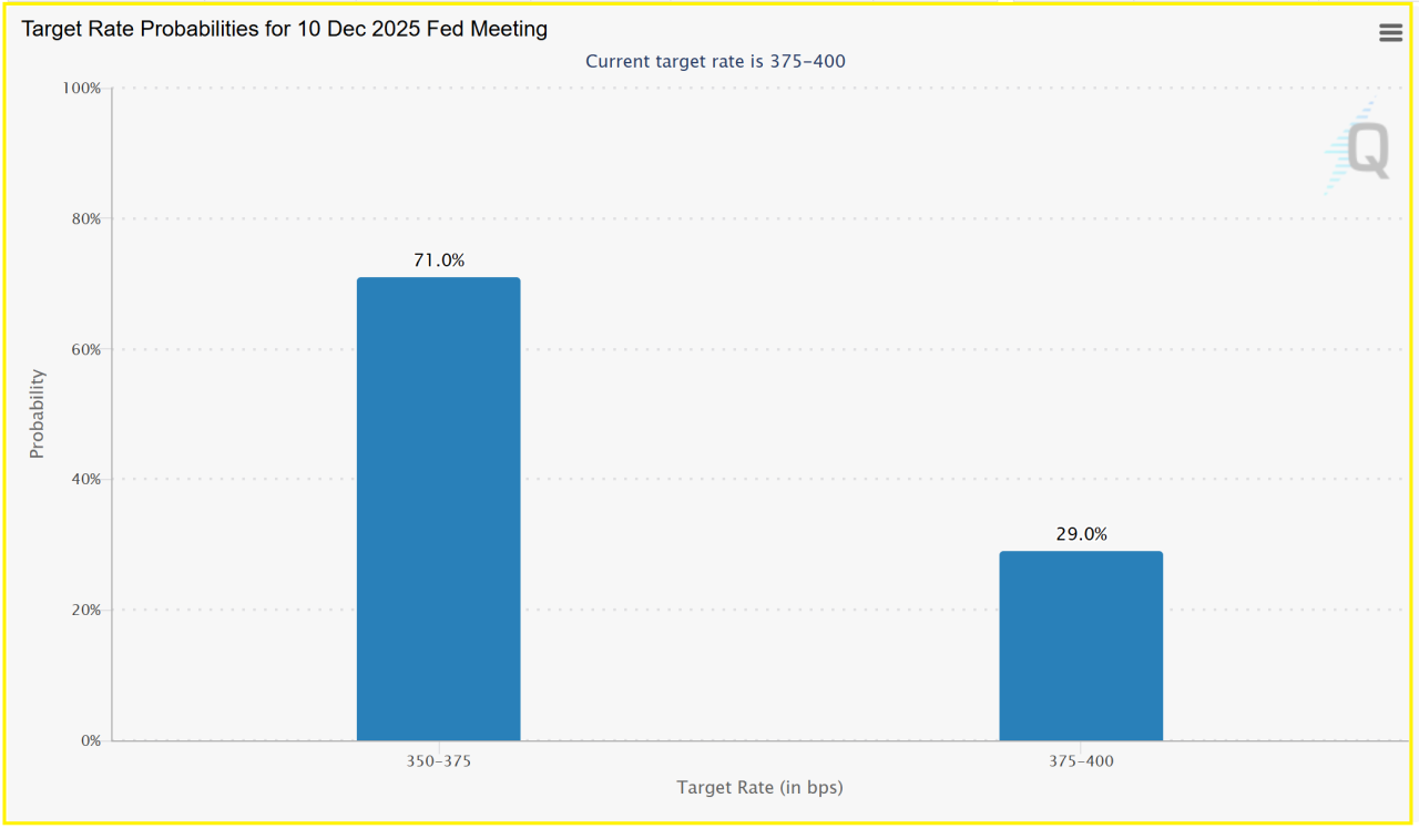 CME FedWatch data now shows a noticeable jump in expectations for an upcoming rate cut. When the market leans toward easier policy, short-term rates fall, which usually encourages investors to take more risk.