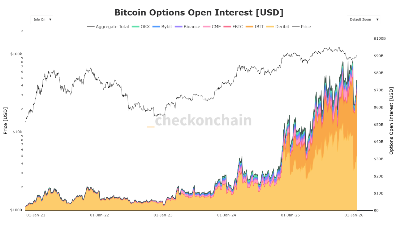 Across major exchanges, options open interest sits about $74B, compared with about $65B in futures.