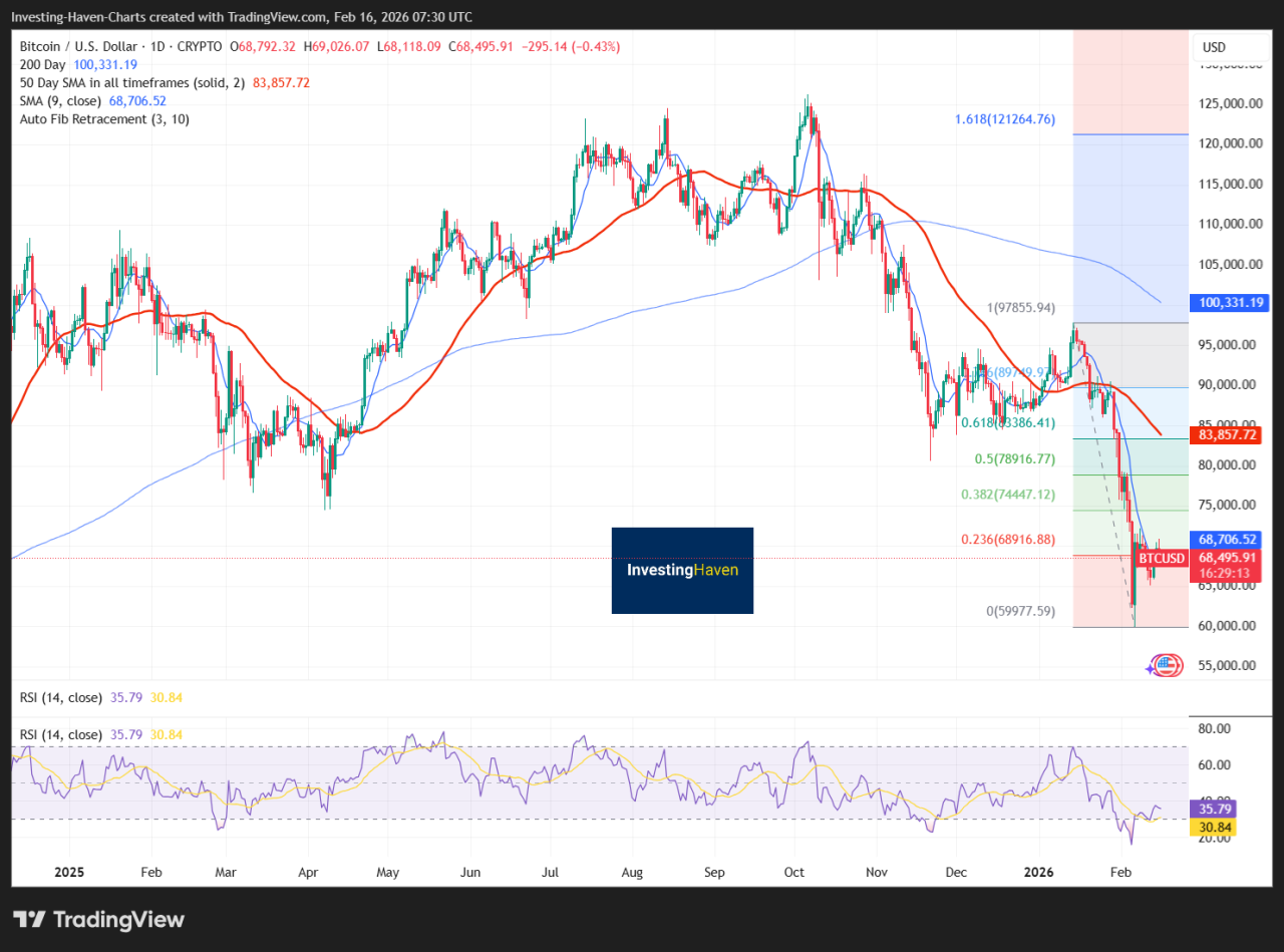 Bitcoin has tested $70,000 several times over the past weeks, yet it has failed to close decisively above it. Each attempt produced a long upper wick on the daily candle. That pattern shows sellers stepping in aggressively once price trades above that level.