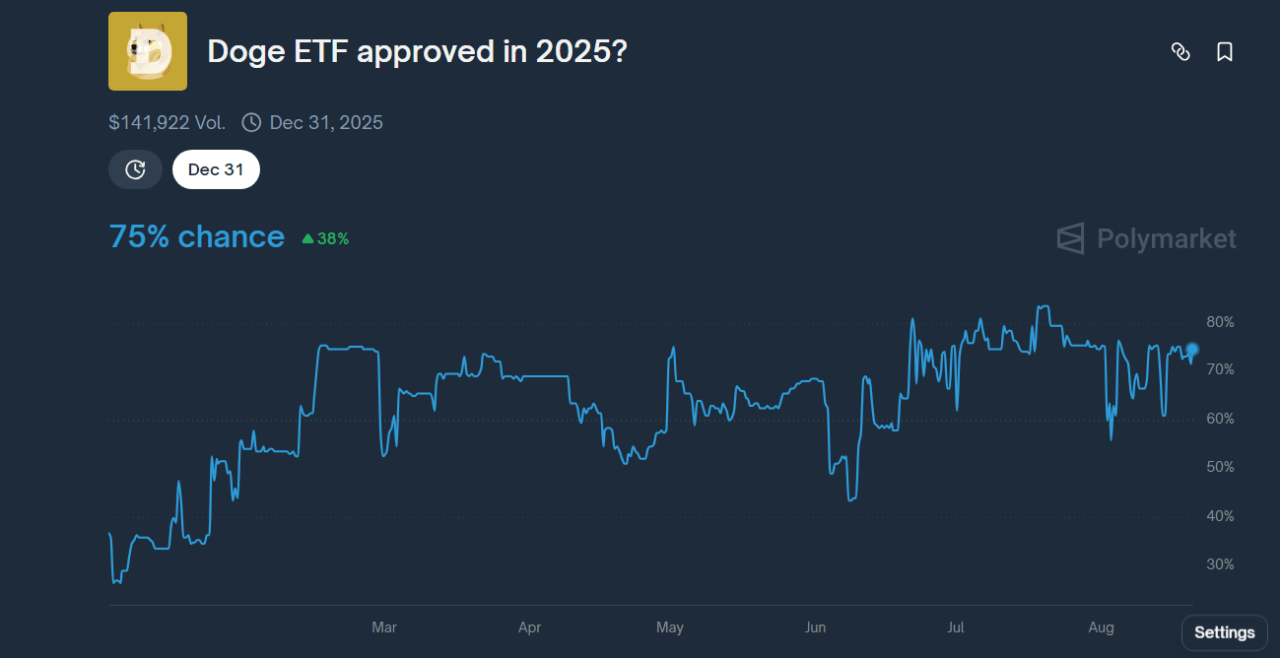 ETF interest adds context: Polymarket odds for a Dogecoin ETF approval stand at 75%, fuelling sentiment.
