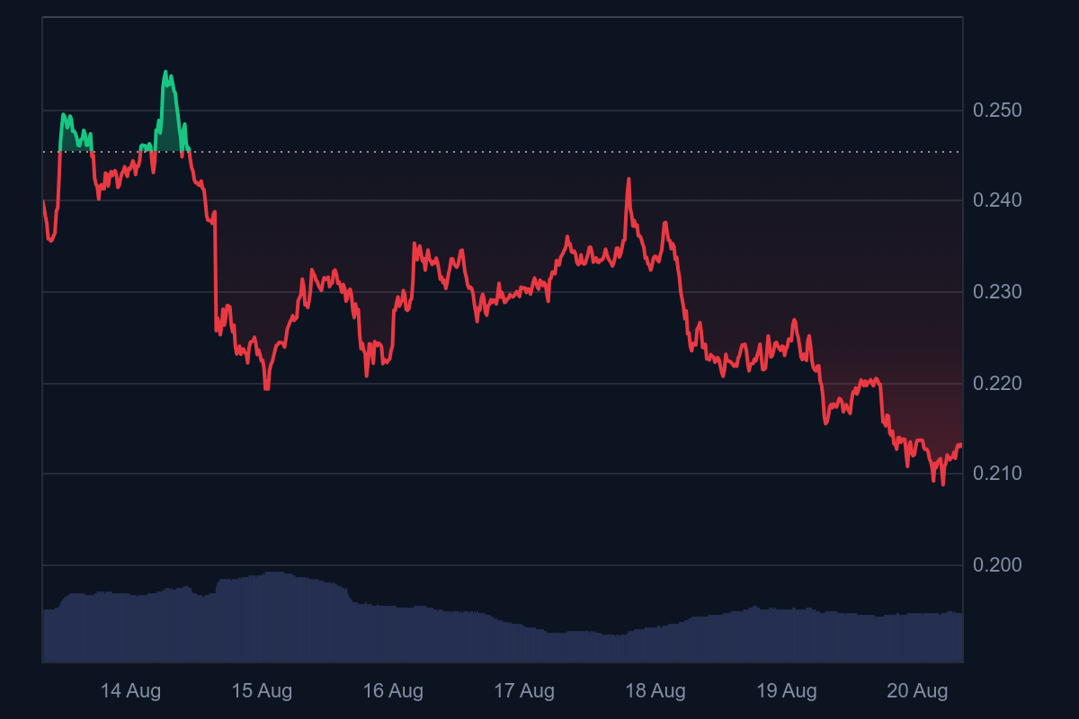 Yet downside remains if support at $0.21 breaks or bearish formations prevail. Traders should monitor volume and key levels closely, as confirmation—or failure—of this triangle setup will likely dictate the coin’s short-term direction.