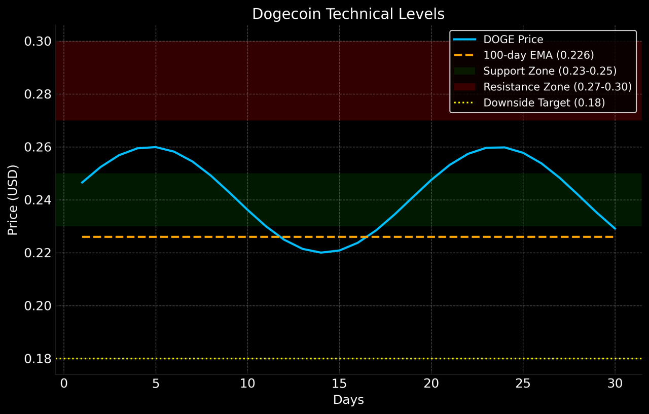 The 100-day EMA sits around $0.226. A daily close above $0.27 would improve sentiment, while a failure below $0.23 could push price toward $0.18.