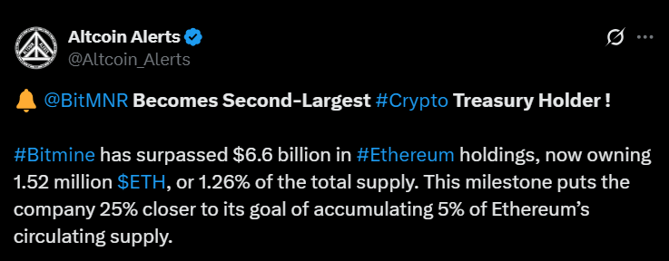 BitMine now holds 1.52 million ETH ($6.6 billion) and plans to raise $20 billion more, targeting over 5% of Ethereum’s total supply.