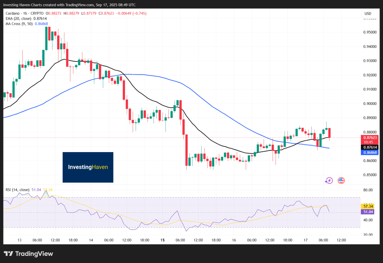 ADA sits between $0.80 support and $0.90 resistance, with most analysts noting $0.95 as the next confirmation level if buyers push through the $0.90 wall.