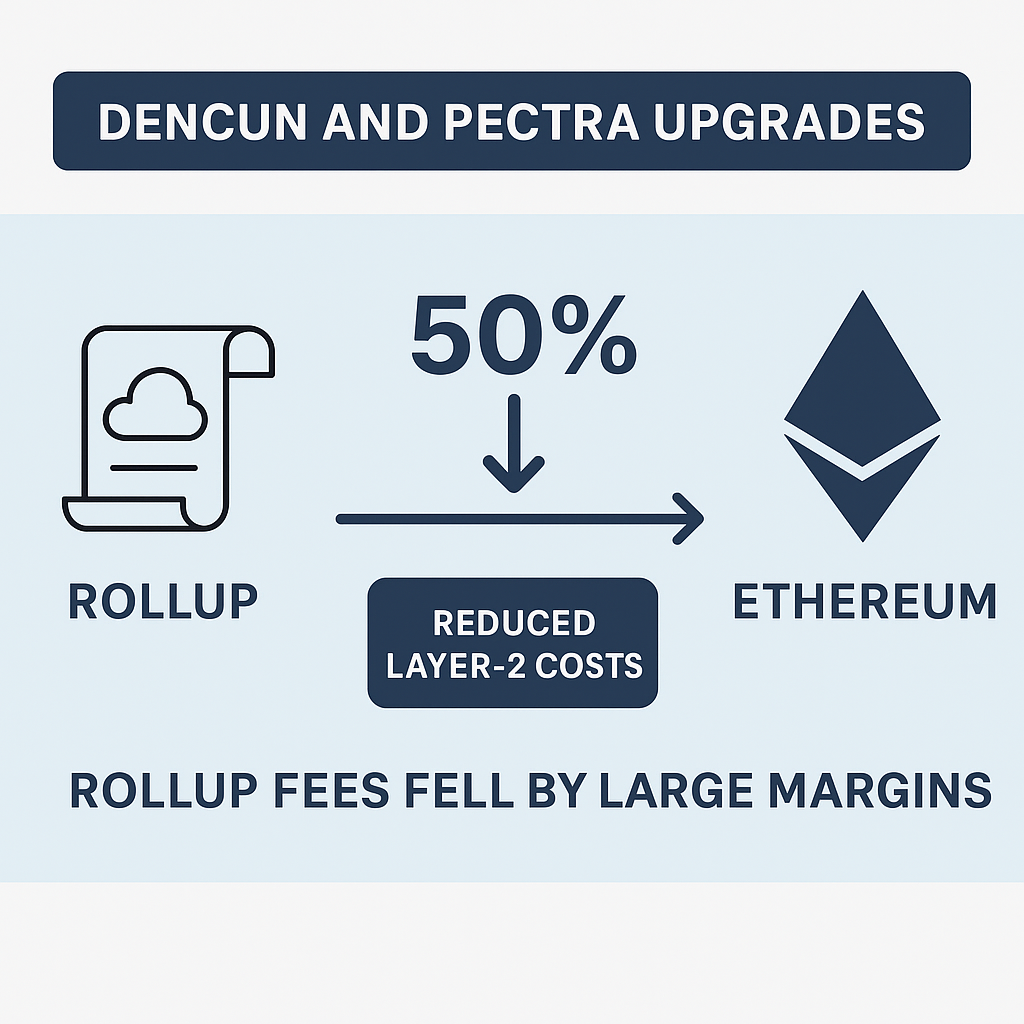 Dencun and the later Pectra upgrade improved how rollups post data to Ethereum, using blob transactions from EIP-4844 to cut Layer-2 costs.