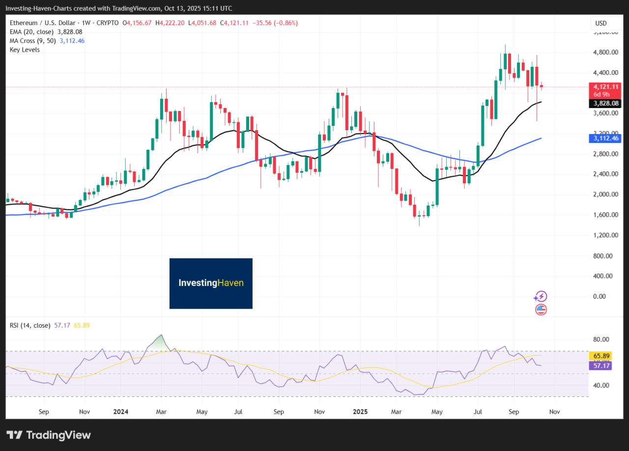 - Ethereum trades around $4,100, just below its all-time high of about $4,946, keeping $5,000 within sight.