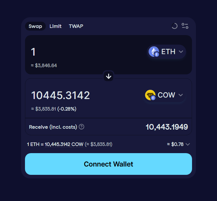 - Select what to sell and buy (i.e., sell ETH → buy COW).