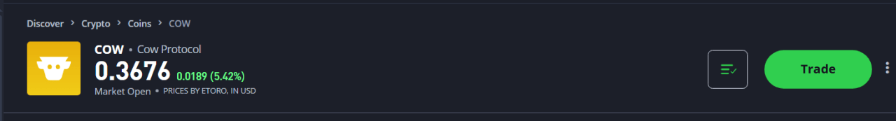 Access to COW on eToro, Binance and Coinbase can be subject to regional restrictions depending on your country of residence – be sure to verify availability in your jurisdiction before depositing.