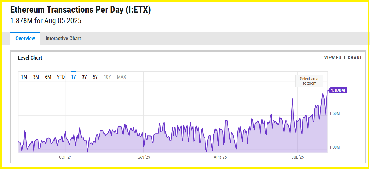 On-chain activity has also surged. Ethereum now processes an average of 1.878 million daily transactions, the highest since 2021.