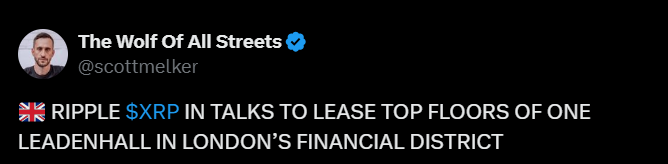 - Ripple plans to lease about 90,000 sq ft at One Leadenhall tower, placing it in London’s core banking district.