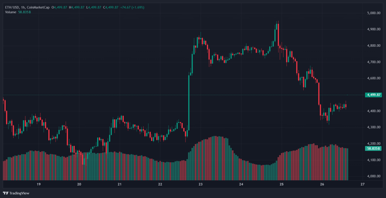 Ether peaked around $4,950 before pulling back. Volume spiked on the sell-off while order books thinned at the highs, magnifying price moves.