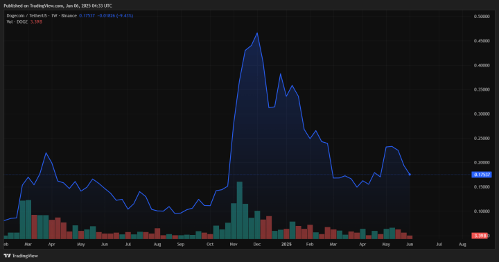 Dogecoin (DOGE) recently dropped from about $0.19 on June 5, plunging over 8% in 24 hours and approximately 16% over the past week. It briefly dipped to $0.1699, but has since recovered to around $0.175.