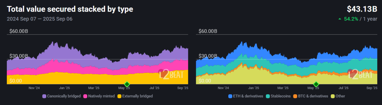 Layer-2 networks reduce fees and raise throughput, while keeping Ethereum’s base-layer security. The total value secured (TVS) in Layer-2s sits around $43.1B as of Sep 6, 2025, showing meaningful economic activity moving to rollups.