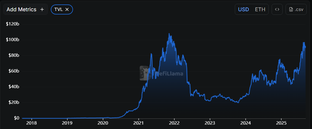 Ethereum adoption shows in measurable activity, not slogans. The chain holds roughly $90–96B in DeFi TVL, and daily active addresses in the mid-500k range, indicating wide protocol use across finance and token markets.