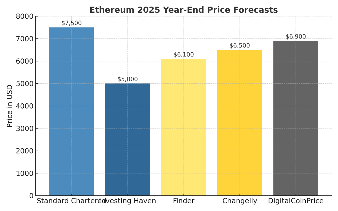 Ethereum price predictions vary widely, with some forecasts reaching $6,500, $7,000, and even up to $10,000 before year-end.