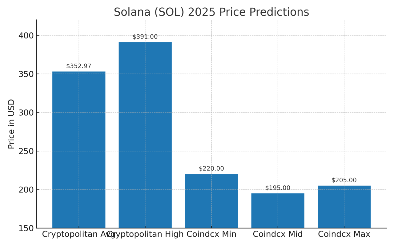 Solana price predictions range from modest gains to aggressive rallies. Cryptopolitan lists a 2025 average of $352.97, with a high near $391. Coindcx and other analysts expect $220+ if SOL holds above $175–$180, with upside toward $195–$205.