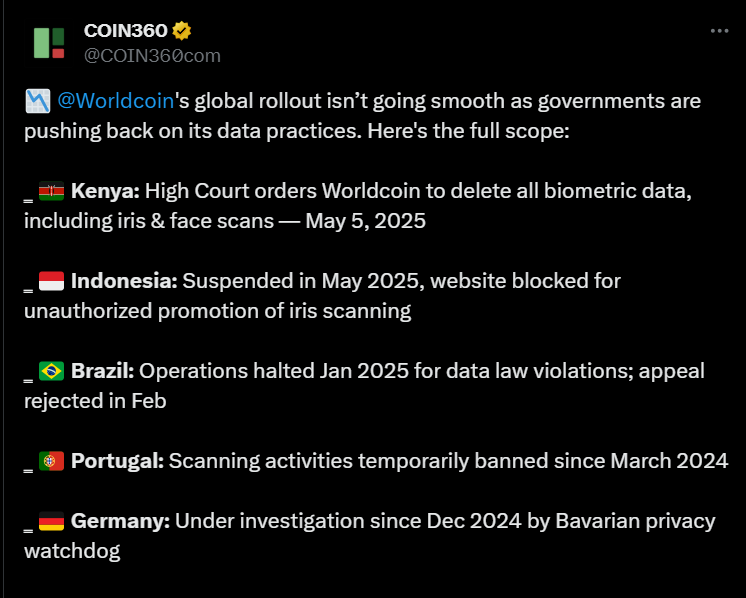 Worldcoin faces significant legal hurdles across multiple regions. On May 5, 2025, Kenya’s High Court ordered operations to stop and required deletion of all biometric data collected, citing violations of the Data Protection Act.