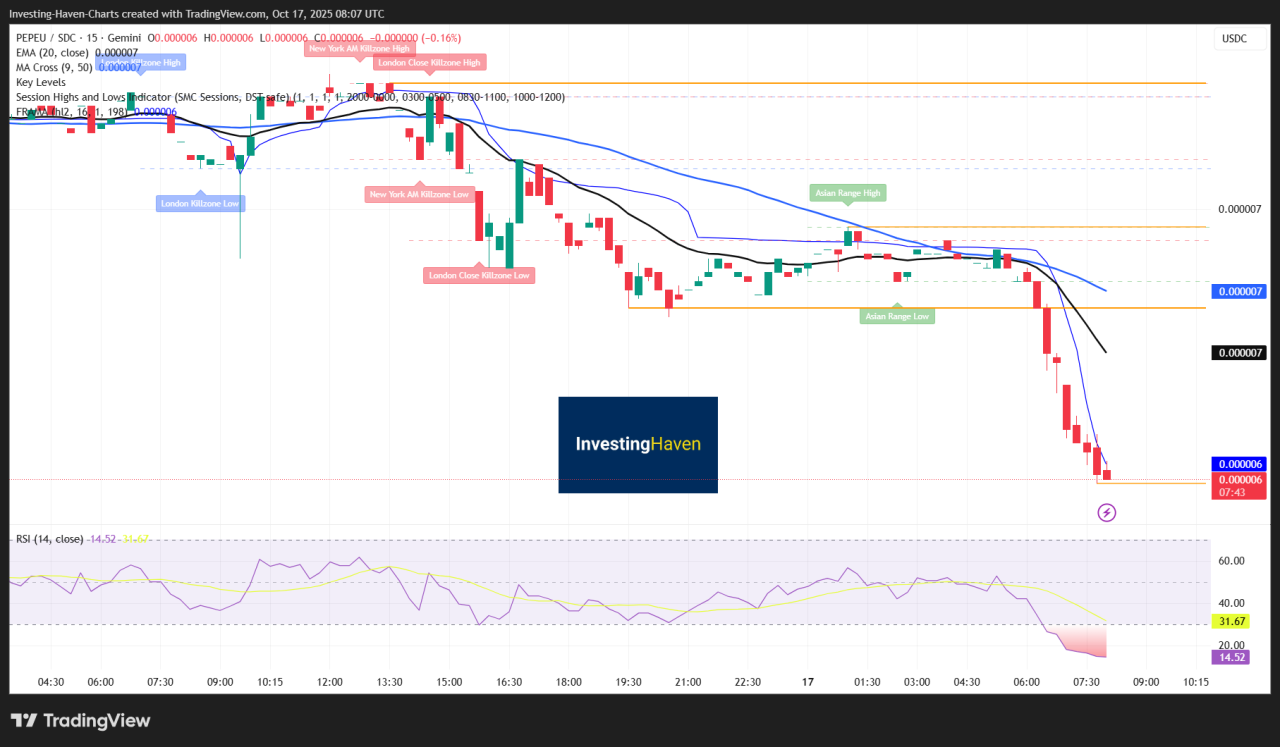 Pepe has come under selling pressure after a recent price drop, now trading around $0.000006 with a market cap near $2.9B.