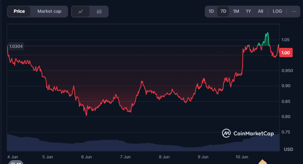 Dogwifhat (WIF) is currently trading around $1.00 (8% s urge in a day), with a market cap just above $1 billion and daily trading volume ranging from $635 m to $740 m across exchanges.
