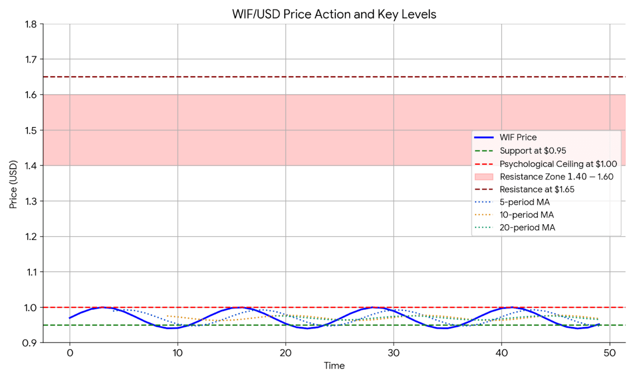 WIF has recently bounced between $0.94 and $1.00, establishing solid near‑term support around $0.95 while struggling to break past the psychological ceiling at $1.00. Lower‑timeframe moving averages (5,10,20‑period) are beginning to converge, signalling a potential bullish crossover.