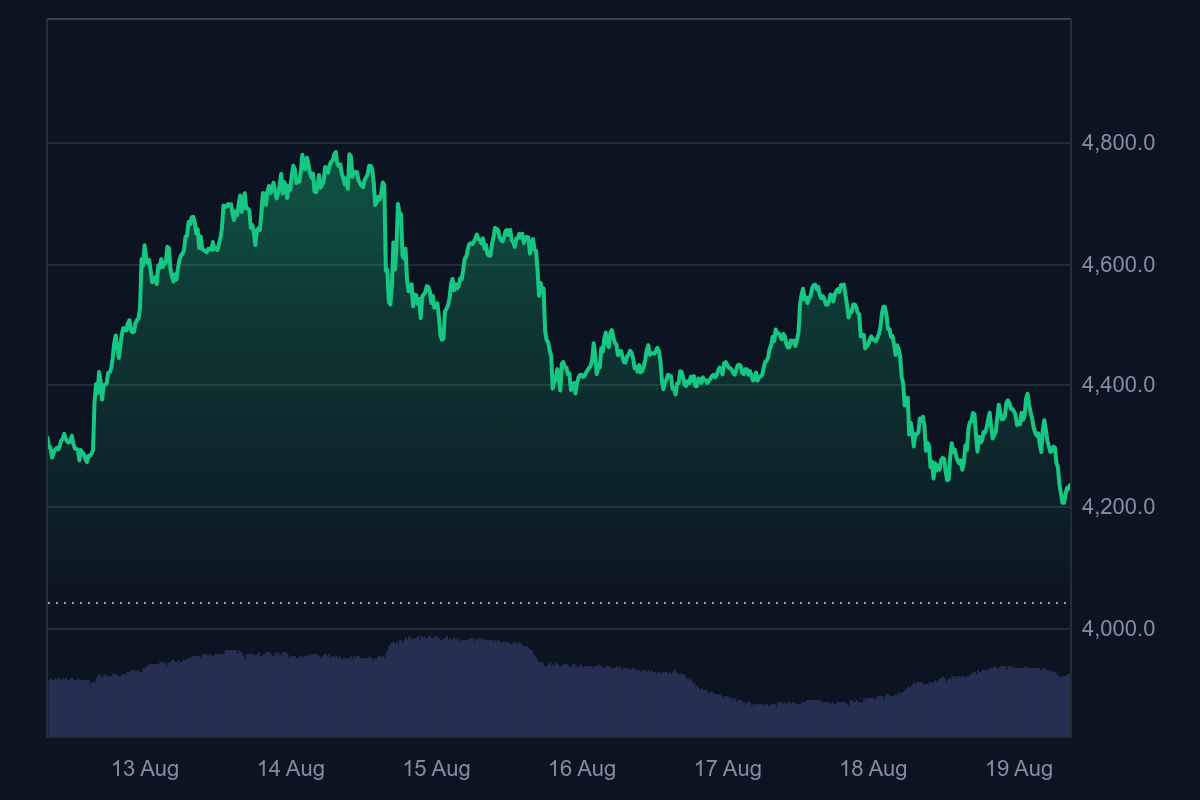Imagine turning $5,000 into $12,500 – or watching it shrink to $3,300. That’s the reality facing Ethereum investors today. As of August 19, 2025, Ethereum trades at $4,237, just 11% below its all-time high of $4,891.