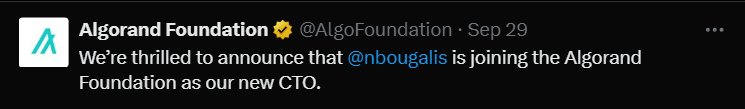On September 29, 2025, the Algorand Foundation named Nikolaos Bougalis as its new Chief Technology Officer.