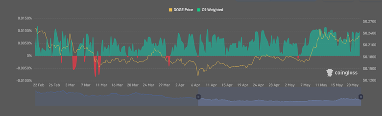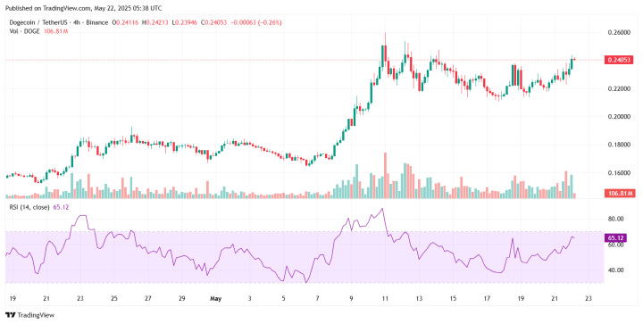 DOGE has had a strong run recently, gaining 43% over the past month. It is currently trading above its 200-day Exponential Moving Average (EMA) at $0.24, a level that has been retested multiple times and held firm.