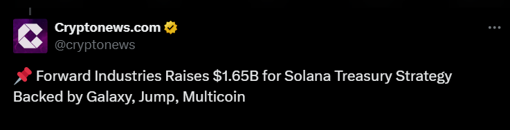 Forward Industries raised $1.65 billion in a private placement led by Galaxy, Jump, and Multicoin to begin a Solana treasury strategy. The company used most of the proceeds to acquire more than 6.8 million SOL, establishing a large corporate holding.