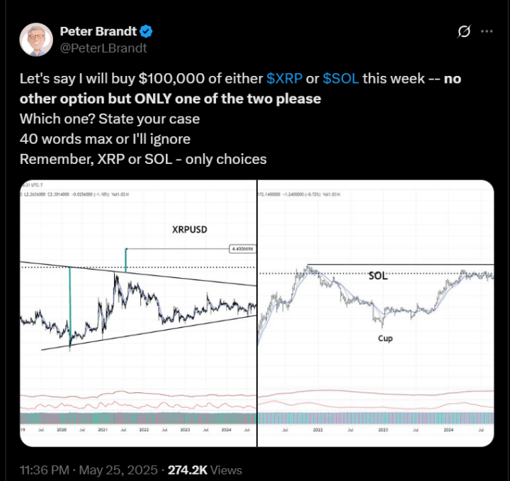Veteran analyst Peter Brandt has identified a cup-and-handle pattern forming on Solana’s weekly chart. This longer-term pattern has a neckline near the all-time high at $295. If SOL can break above this level, the projected target could reach an ambitious $518.