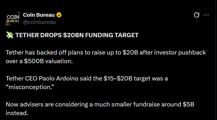 - Tether scaled down a proposed $15–$20 billion fundraising plan after pushback on valuation.