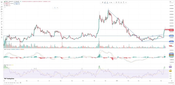From a technical perspective, PEPE has been in consolidation throughout March and April, after an extended phase of price drop, from its all-time high of $0.00002825 set in December 2024 to around $0.000005307 in early March.