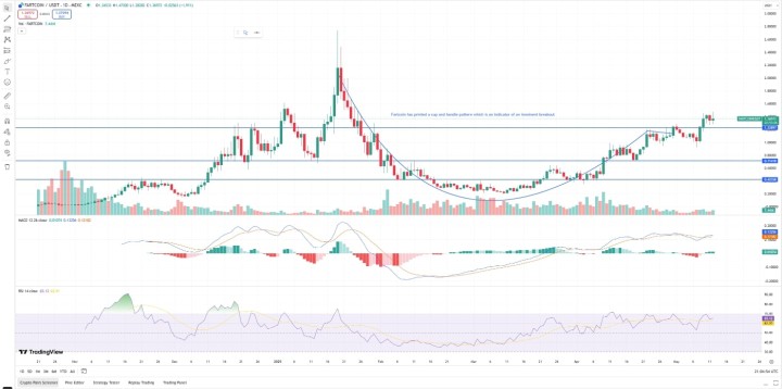 From a technical perspective, FARTCOIN looks poised for further gains ahead. It has recently broken out of a cup and handle pattern and tore above the key resistance around $1.23 level. A bunch of its other technical indicators are bullish as well.