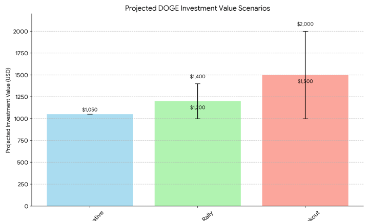 Using conservative models—like Kraken’s projection of ~5 % annual growth—DOGE might modestly climb to $0.195, translating to about $1,050 in a year. More aggressive technical and hype scenarios could yield anywhere from $1,200–1,400 in a moderate rally to $1,500–2,000 in a viral breakout.