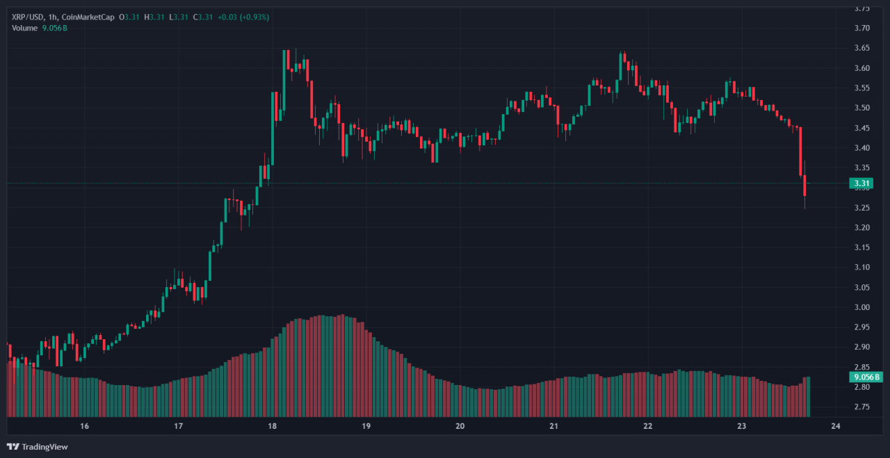 From a chart‑analysis standpoint, XRP has broken out of a six-year symmetrical triangle and a July flag/triangle consolidation, climaxing in a rally past $3.60. Fibonacci extensions now point toward targets near $6, but the next realistic milestone is $4–4.40.