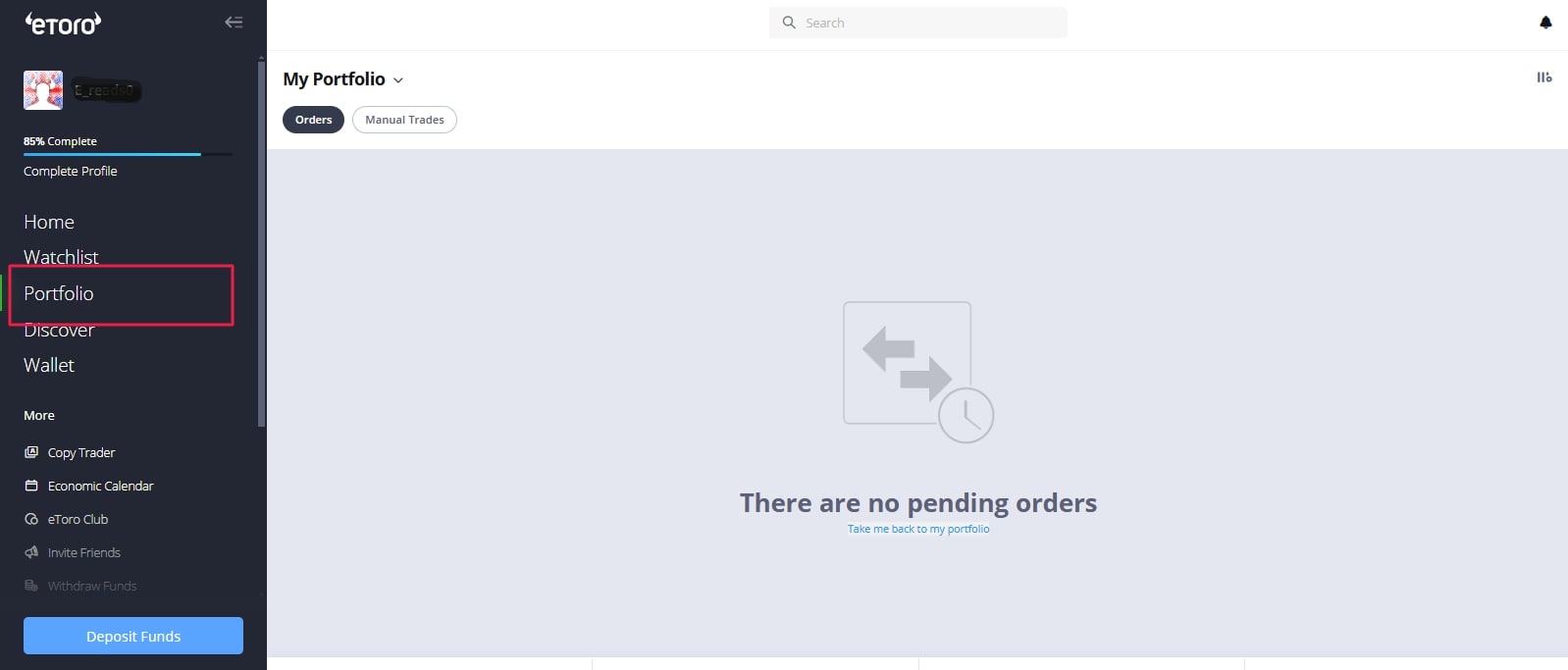 Step 2: On the user dashboard, hit the “Portfolio” icon on your user dashboard. This will bring up a window that lists all the coins you have bought on the eToro crypto exchange.