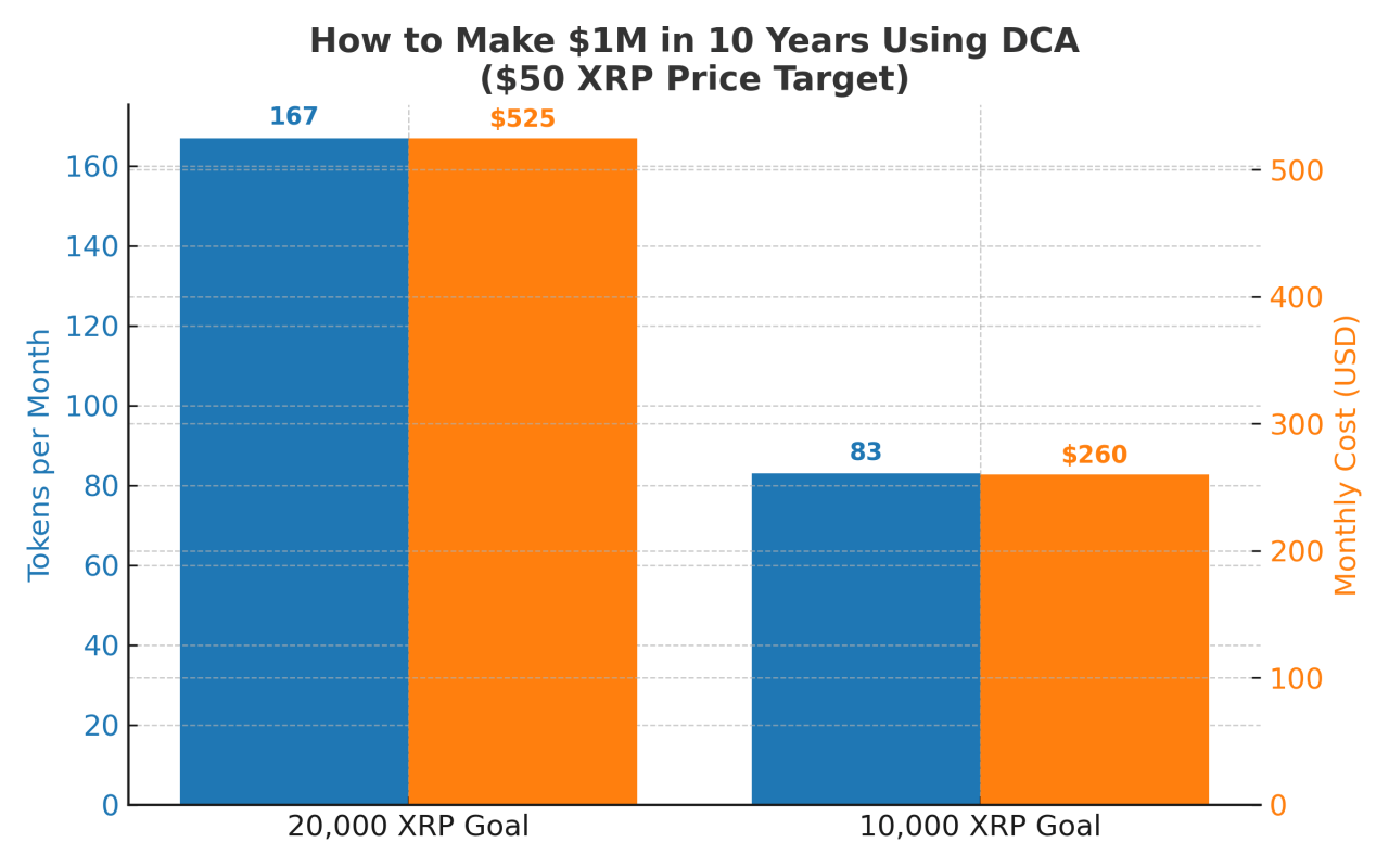 With disciplined dollar-cost averaging over ten years, accumulating XRP toward a $1 million target becomes feasible if token price rises sharply.
