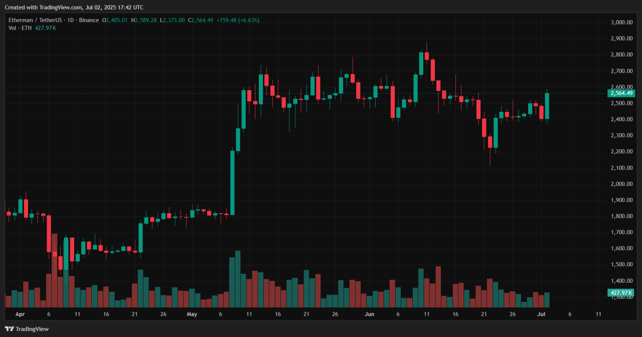 On the other hand, Ethereum hovers just over $2,520, held within a tight range of $2,425–$2,750. But whale accumulation is hitting multi-year highs, coupled with steady ETF inflows and on-chain staking, pointing to a breakout toward $3,500–$5,800.