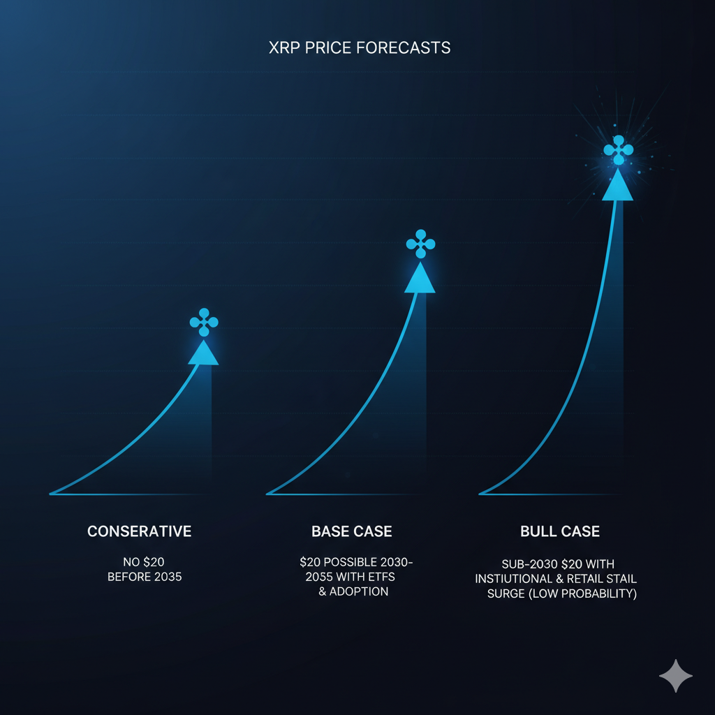 - Bull case: A sub-2030 $20 needs an outsized institutional and retail surge, a low probability outcome.