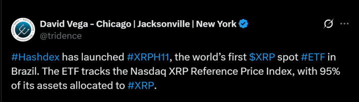 XRP’s fundamentals are strengthening, particularly through institutional developments. Brazil’s B3 exchange recently launched XRPH11, the world’s first Ripple-based ETF, allocating 95% of its assets to XRP.