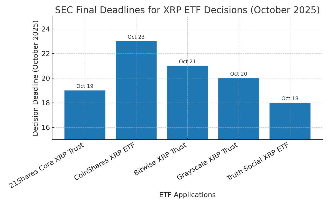 The U.S. Securities and Exchange Commission pushed decisions on five spot XRP ETF proposals into October, setting final deadlines between October 18 and 23 for firms such as Grayscale, 21Shares, CoinShares, Bitwise and others.