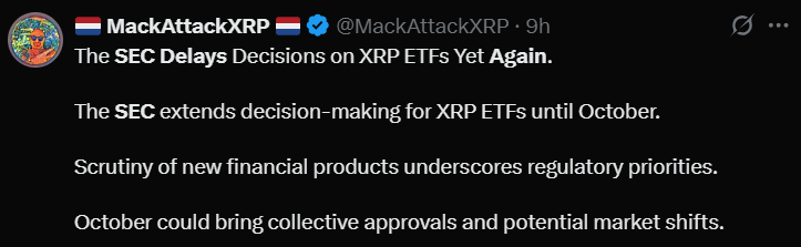 The U.S. Securities and Exchange Commission pushed decisions on five spot XRP ETF proposals into October, setting final deadlines between October 18 and 23 for firms such as Grayscale, 21Shares, CoinShares, Bitwise and others.