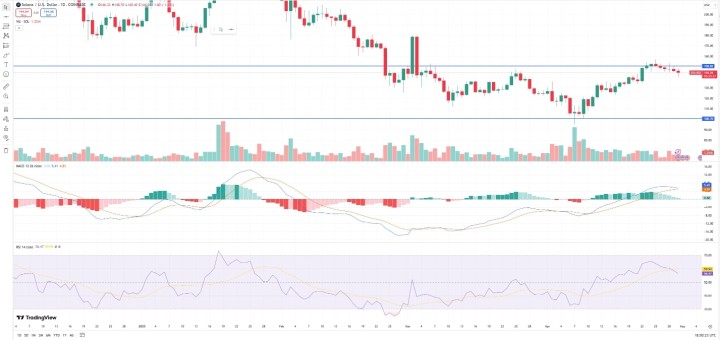 At the time of writing, SOL trades around $142, slightly below the minor resistance of $150. In the daily timeframe, its MACD is beginning to flatten, though it is still in positive territory. The RSI has also cooled around the comfortable bull territory of 54.