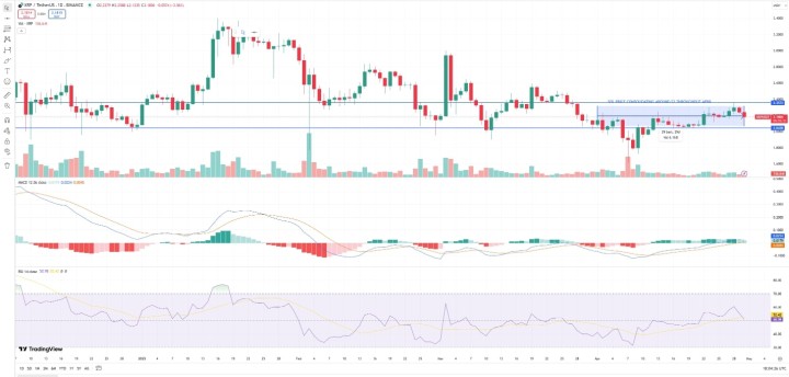 Meanwhile, the RSI index has dropped from the bullish territory above 60 to the neutral zone at 49. For days, the XRP price has been consolidating sideways without significant trading volumes.